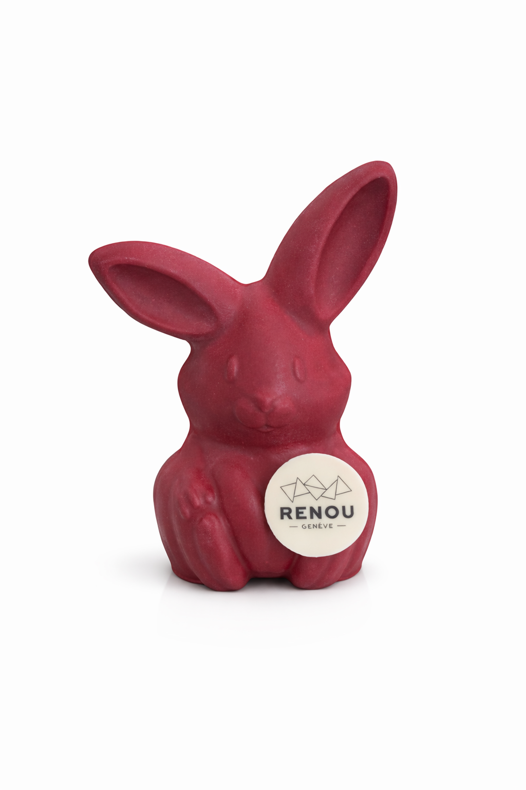 Moulage en chocolat au lait en forme de lapin garni de friture artisanale en chocolat au lait praliné.
