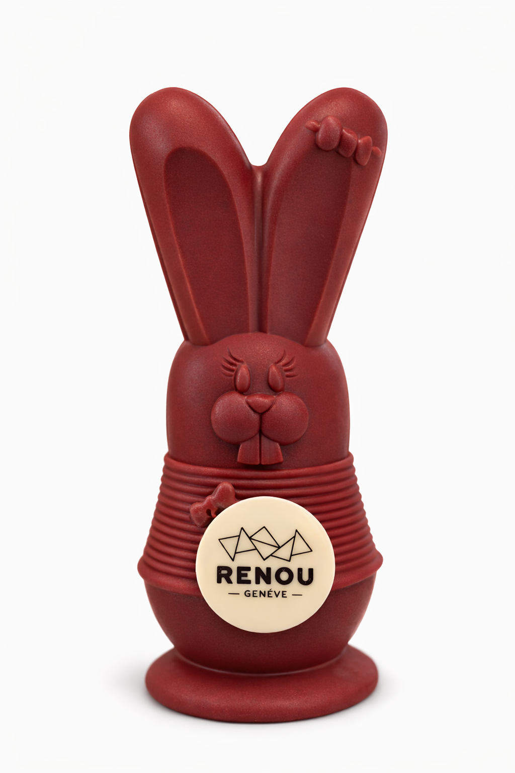 Moulage en chocolat au lait en forme de lapin garni de friture artisanale en chocolat au lait praliné.