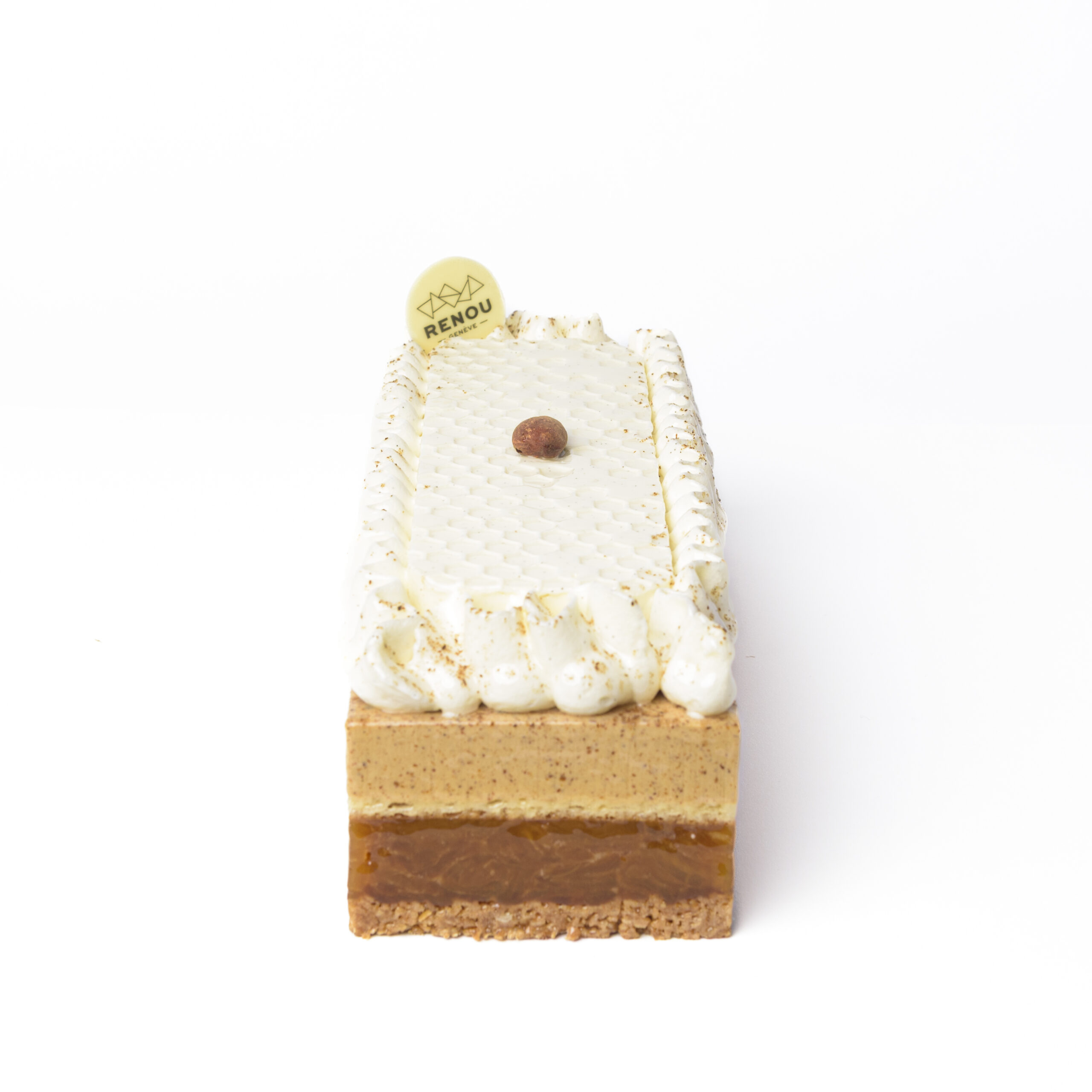 Fond sablé croustillant, pomme caramélisées, biscuit moelleux, mousse légère praliné amande, vanille de Madagascar.