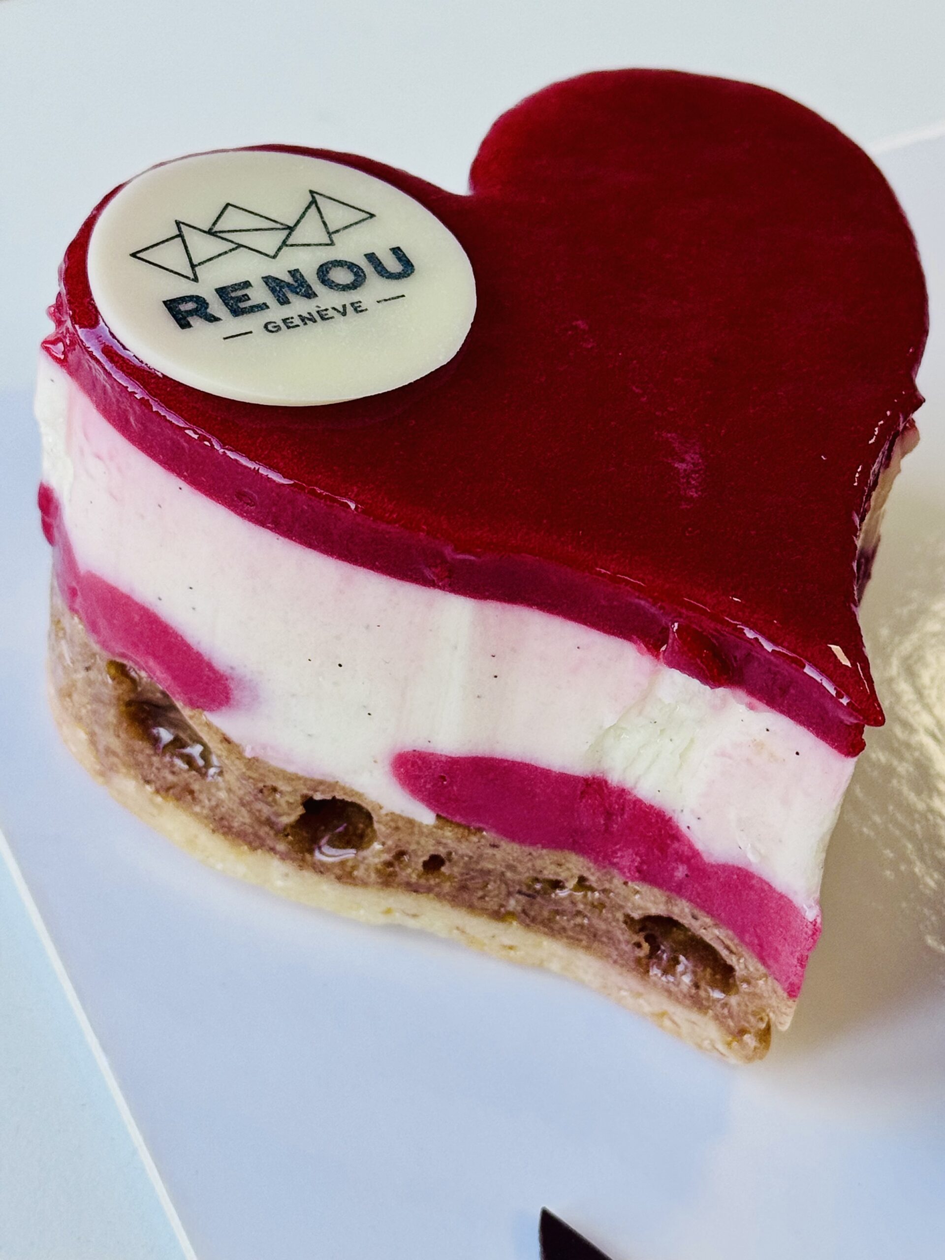 L’As de cœur rose framboise, pâte sucrée croquante, financier praliné amande, crémeux framboise, crème légère vanille de Madagascar, confit framboise rose.