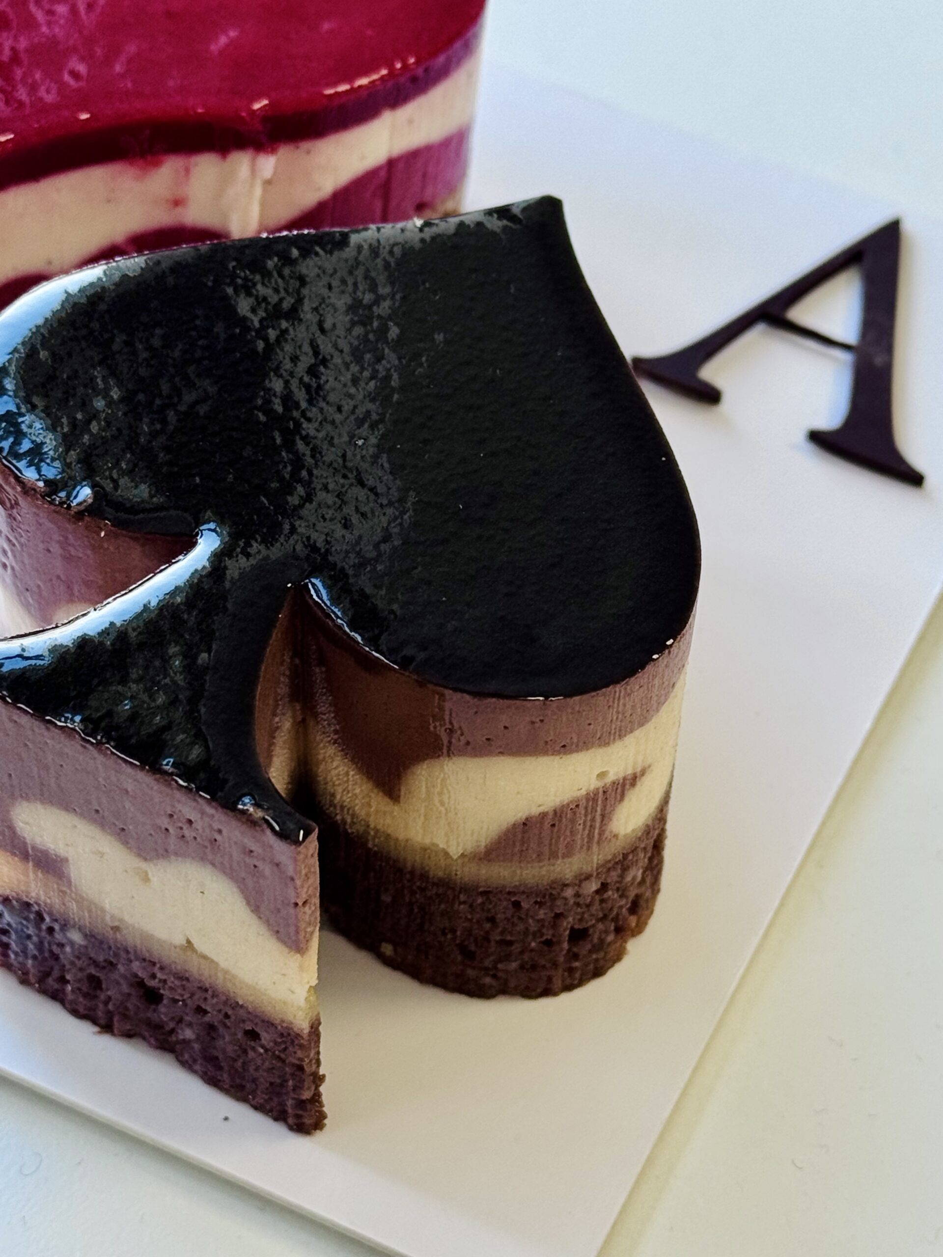 L’As de pique poire chocolat, pâte sucrée cacao croquante, financier chocolat amande, confit poire williams, crémeux poire williams, mousse légère chocolat Caraïbe 66%