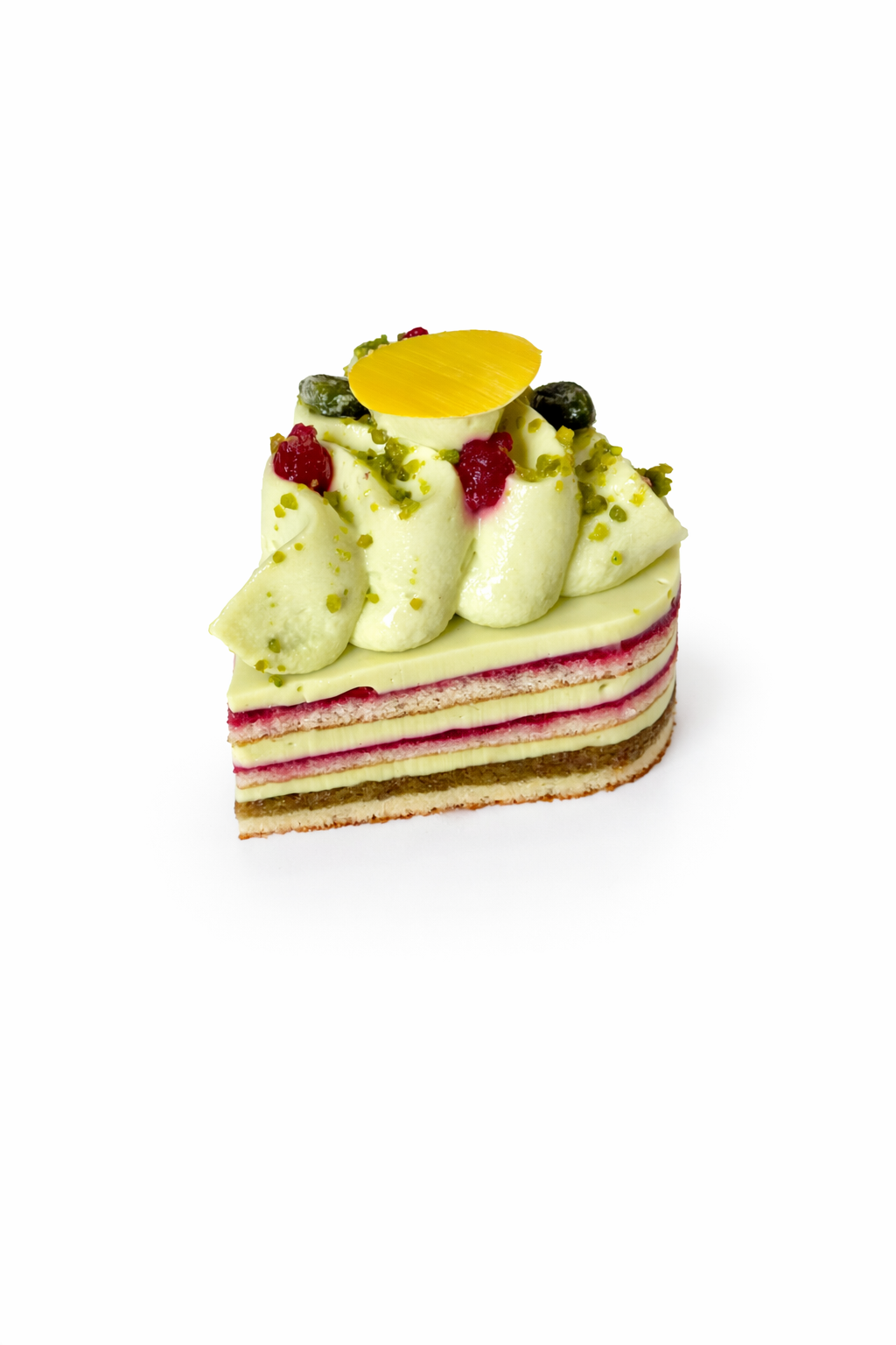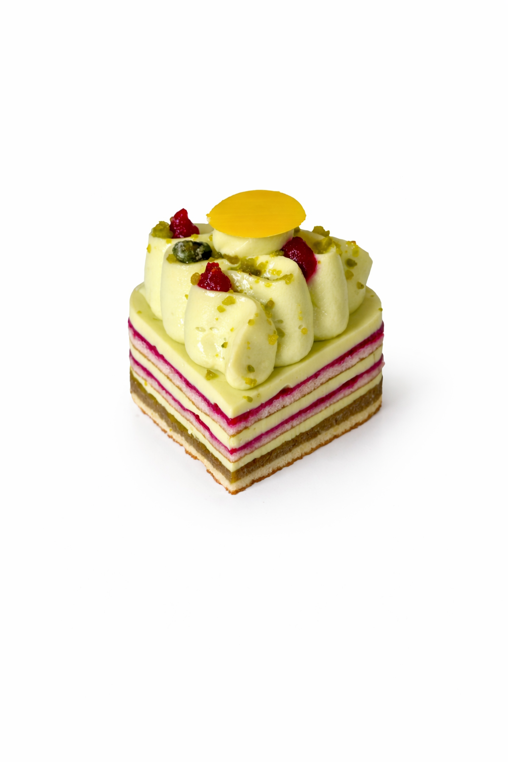 Sur un biscuit viennois, un croustillant pistache, un confit de griotte et une ganache montée pistache