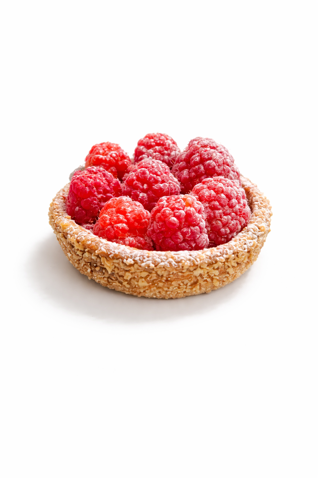 Pâte sucrée amande saupoudrée de cassonade, crème d’amande, confit fruit rouges, framboises fraîches.
