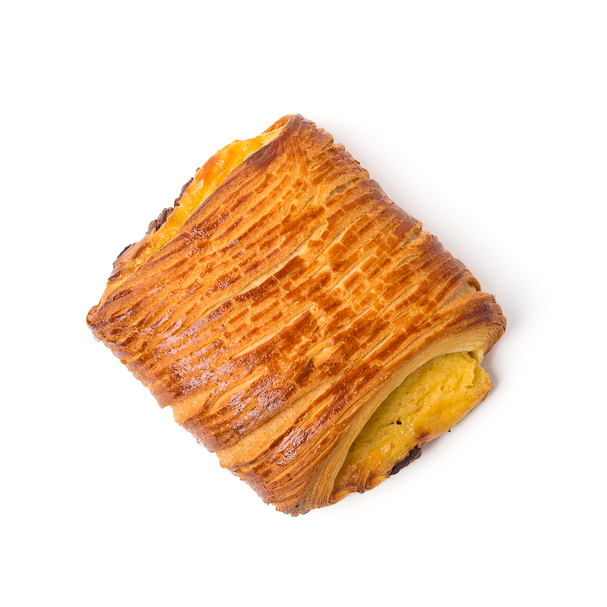 Tout le plaisir d’une technique de feuilletage traditionnelle à la française, d’une crème pâtissière et de pépites de chocolat noir.